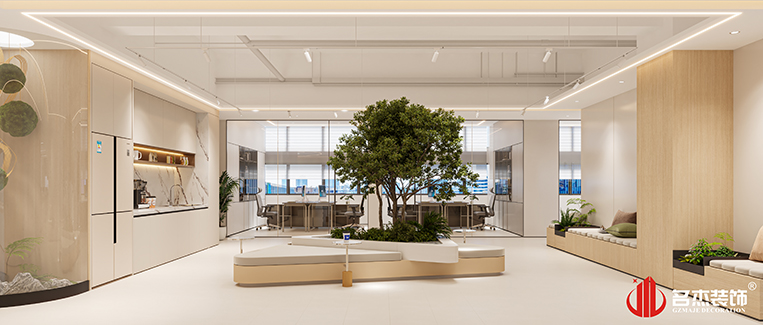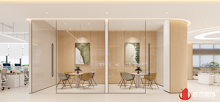 設計團隊在整體辦公室裝修設計空間中多次使用弧形元素,讓空間充滿著更多的設計層次感。同時根據客戶的行業定位,在空間中引入一整顆綠植,讓空間充斥著綠植的元素,也帶來更多大自然的氣息。#廣州辦公室裝修#